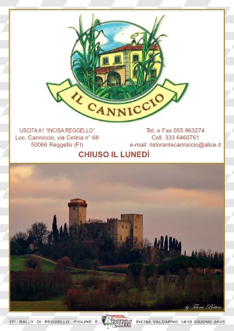 USCITA A1 “INCISA REGGELLO” Tel. e Fax 055 863274 Loc. Canniccio, via Cetina n° 68 Cell. 333 6460761 50066 Reggello (FI) e-mail: ristorantecanniccio@alice.it CHIUSO IL LUNEDÌ 17° RALLY DI REGGELLO, FIGLINE E INCISA VALDARNO 14-15 GIUGNO 2025 81