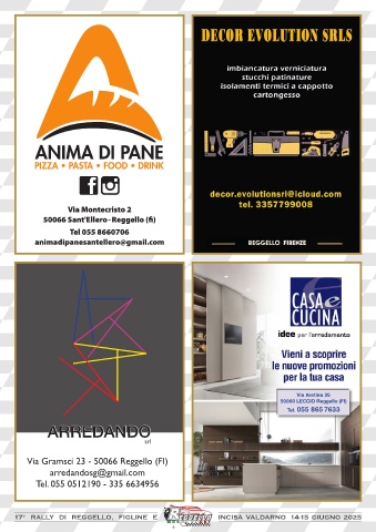 Via Aretina 35 50060 LECCIO Reggello (FI) Tel. 055 865 7633 ARREDANDO srl Via Gramsci 23 - 50066 Reggello (FI) arredandosg@gmail.com Tel. 055 0512190 - 335 6634956 17° RALLY DI REGGELLO, FIGLINE E INCISA VALDARNO 14-15 GIUGNO 2025 9